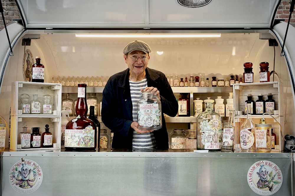La Grande Droguerie Poétique a quelque chose d'extraordinaire en ce qu'elle ne vend rien, strictement rien, mais promotionne l'essentiel. Dominique Maes, son Président Directeur Généreux est un illustrateur bien connu des Belges et Français. De nombreux albums à son actif, il a décidé de poser son gros bagage dans l'édition le temps de partir à la rencontre du public...à sa façon. Une petite merveille d'arts plastiques vivants.