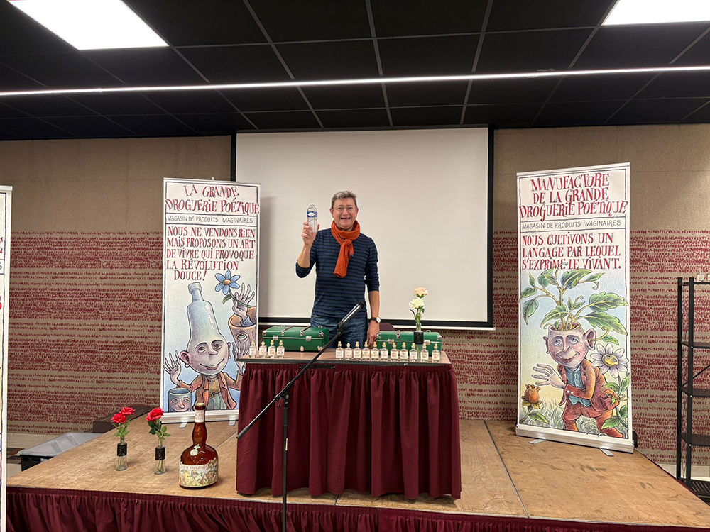 Ce fut la présentation spectacle sur la scène du petit théâtre, de quelques produits indispensables de la Grande Droguerie Poétique.